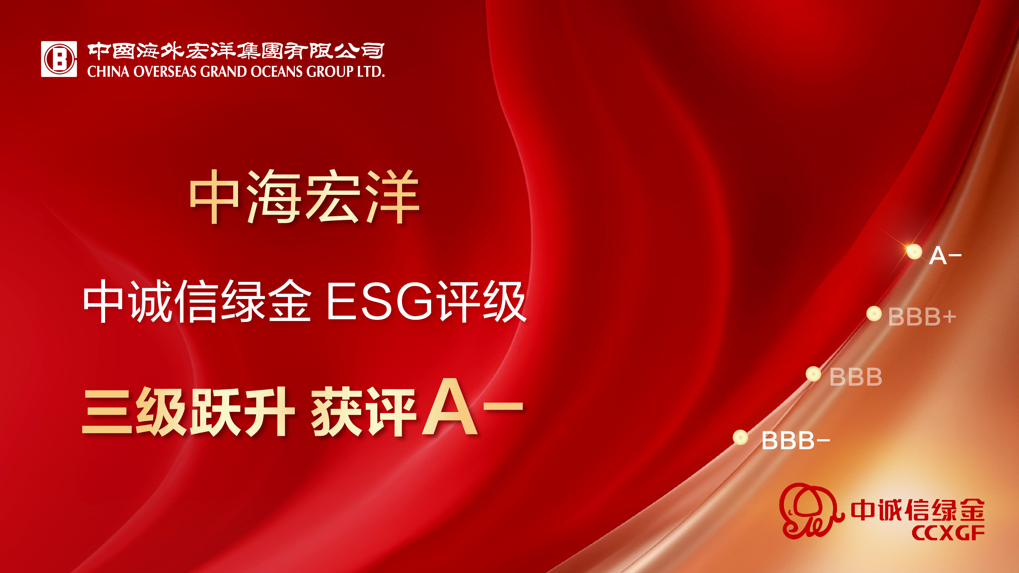 憑藉在環境保護、社會責任、企業管治等方面的全面深耕,中海宏洋中誠信綠金ESG評級由BBB-實現三級躍升獲評A-,排名行業前5%。中誠信是國內第一,全球第四的評級機構,展業30餘年,專業度及規範性受到監管、發行人、投資者及中介機構等市場參與者的廣泛認可。