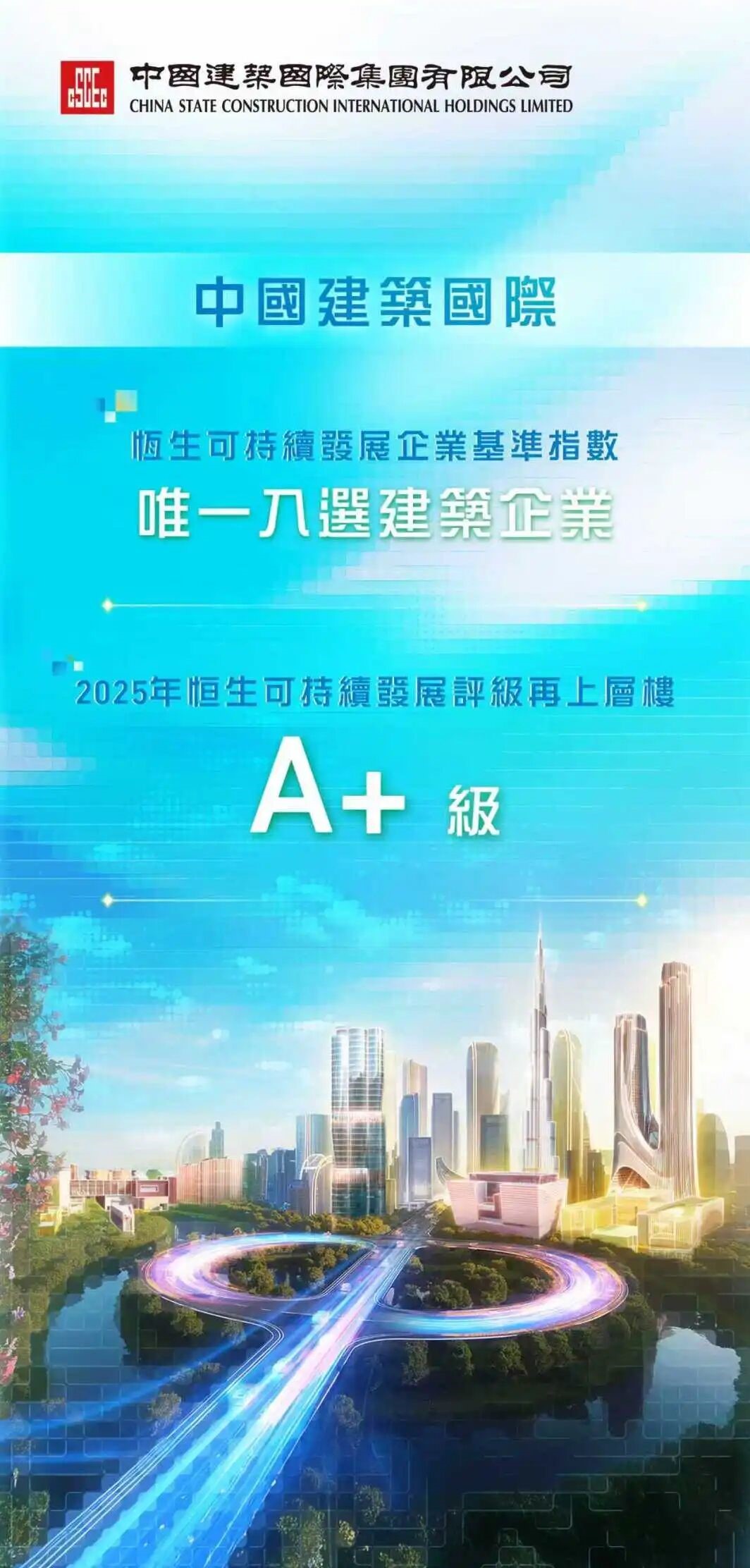 近日,恒生指數公司發布2025年上市公司可持續發展評級結果。中海集團旗下中國建築國際集團有限公司憑藉ESG(環境、社會及治理)方面的良好表現,評級由A上調至A+,再度入選恒生可持續發展企業基準指數(簡稱HSSUSB)——再度成為唯一入選的建築企業。