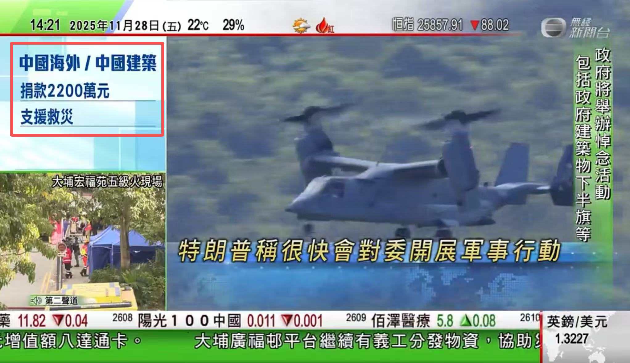 11月28日,中國海外/中國建築宣佈,公司捐款2000萬港元、員工個人首批捐款208.06萬港元,支援香港大埔宏福苑火災救援,用於應急救災和災後恢復等工作,幫助受災居民渡過難關。